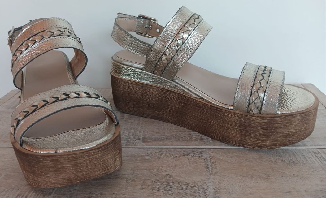 SANDALIA DE CUERO DORADA CON BASE DE MADERA